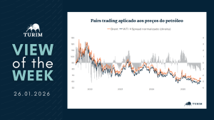 O gráfico desta semana ilustra um exemplo clássico, comparando os preços do Brent e do WTI. Ambos são commodities de petróleo cru, mas negociadas em mercados distintos e sujeitas a pequenas diferenças relacionadas a qualidade e logística. Apesar disso, por estarem expostos aos mesmos choques globais de oferta e demanda, é natural que apresentem comportamento semelhante ao longo do tempo.